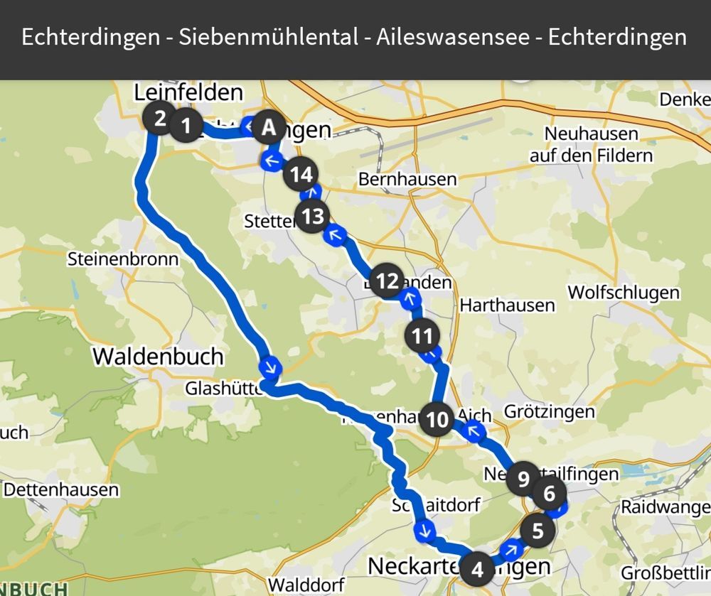 Wir fahren, von Echterdingen-Bahnhof über das Siebenmühlental und Neckartenzlingen zum Aileswasensee in Neckartailfingen.